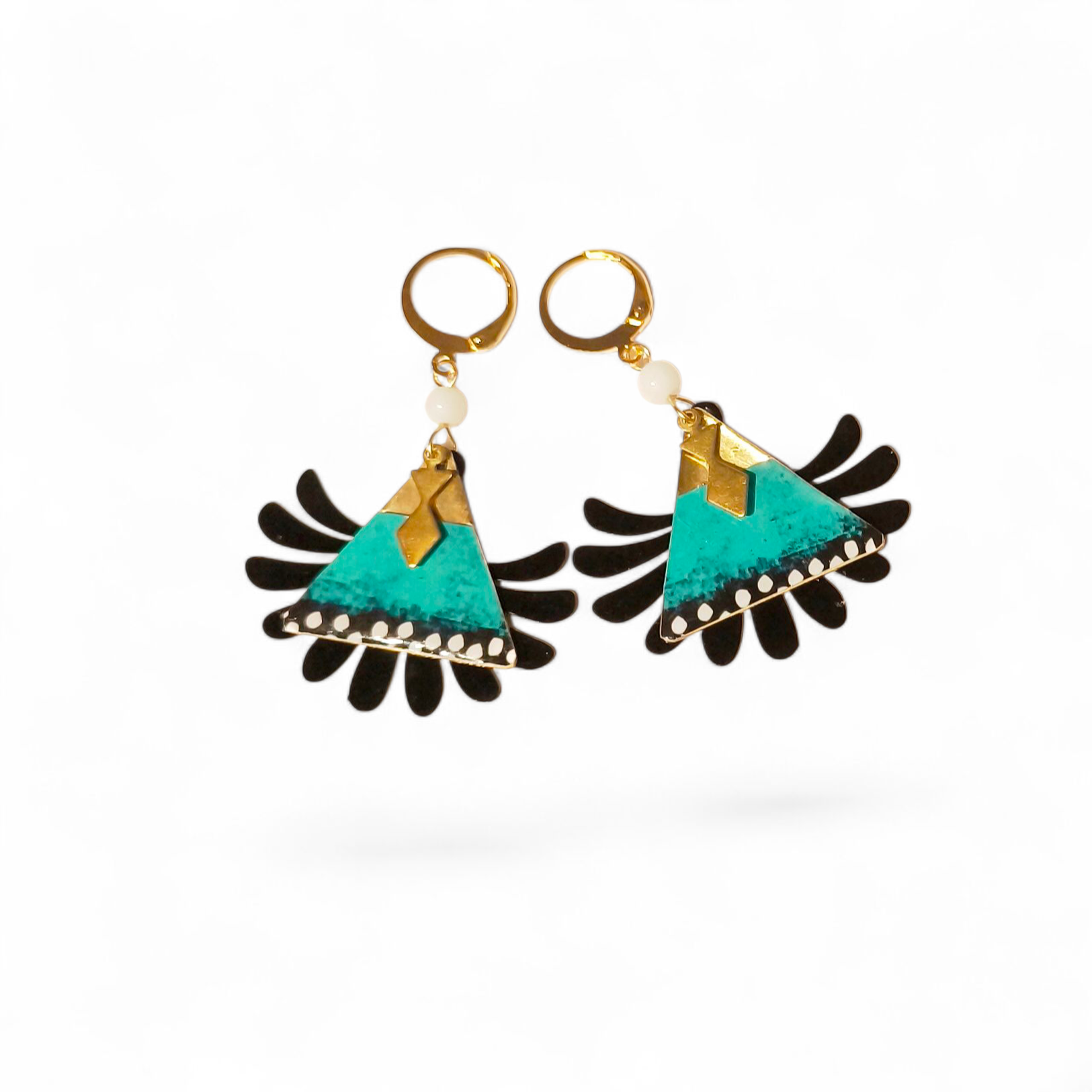 Boucles d’oreilles avec pièce laiton motif résiné, filigrane et breloque en laiton.