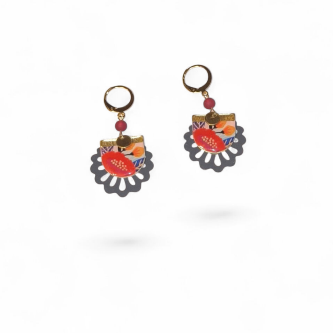 Boucles d’oreilles avec pièce laiton motif résiné, filigrane et breloque en laiton.